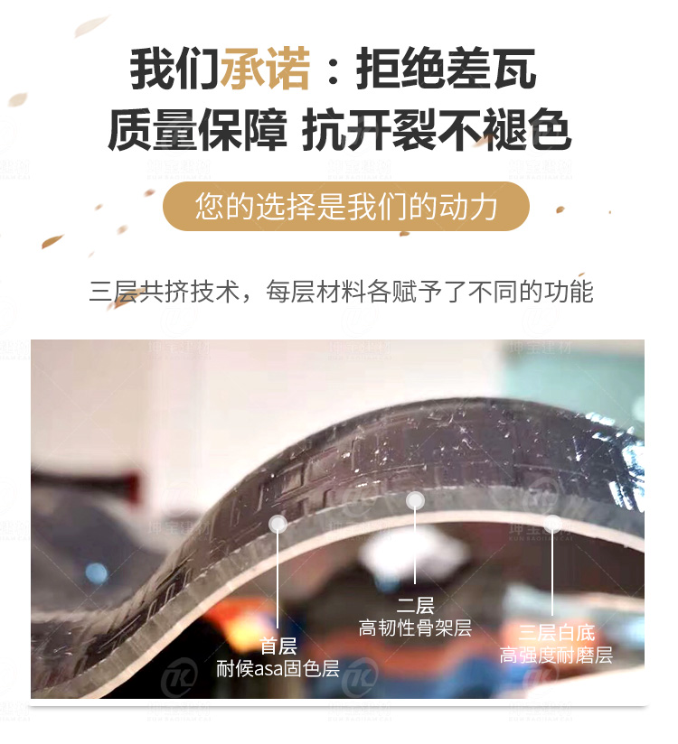 樹脂瓦是材料創(chuàng)新的得意成果,是運用高新化學化工技術研制而成的建筑材料,是傳統(tǒng)屋面瓦替代品。樹脂瓦具有重量輕、強度大、防水防潮、防腐阻燃、隔音隔熱等多種優(yōu)良特性,成為我國推行節(jié)能不可缺少的建筑材料。