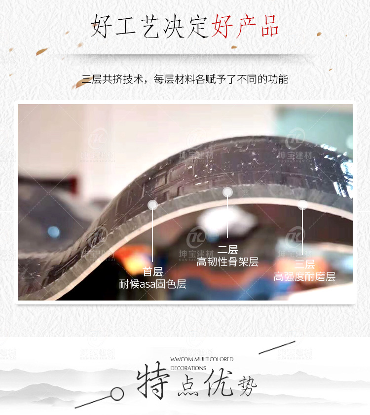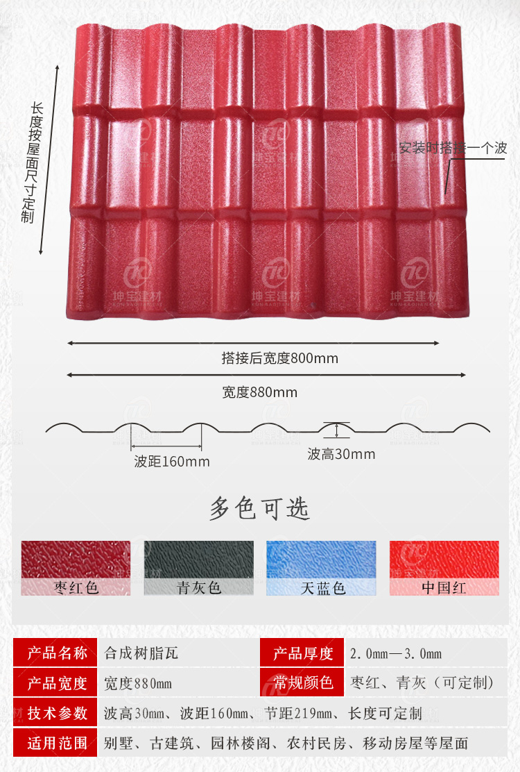 《坤寶牌》合成樹脂屋面瓦,原料采用高耐候性ASA樹脂研制,中間是發泡隔熱骨架層,底層為高強度耐磨層。防腐耐候性能**,承載力好,能夠抵擋酸堿鹽侵蝕,化工廠房及污染惡劣環境都適用。由于合成樹脂屋面瓦屬于高分子聚合物,本身瓦面就致密不吸水,大大提升防水效果,而且具有荷葉效應,灰塵雜物等不容易堆積在屋面上,減輕了瓦面的負擔及房梁的承重,還可延長了合成樹脂屋面瓦的使用壽命。